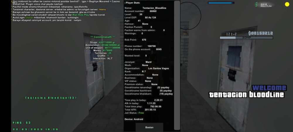 22. 1 - نام حساب کاربری شما :Titan_Bloodline 2 - سطح حساب کاربری شما :29 ۳ - سن شخصیت حساب کاربری شما :17 4 - سوابق خود را در سازمان های جنایی شرح دهید : Grove Street Rifa Vagos Balas Aztecas توجه : عکس از wbook/ و stats/ حساب کاربری خود را حتما در پیام ارسال فرم بارگذاری کنید. اطلاعات OOC 1 - آیدی تلگرام :@DerHoseiN 2 - آیدی دیسکورد : ندارم 3 - مقدار تایم پلی روزانه :3 4 - در چه حد از رول پلی آگاهی دارید و به قوانین آن مسلط هستید ؟کامل 5 - در چه حد با نحوه کارکرد سایت انجمن آشنایی دارید ؟کامل