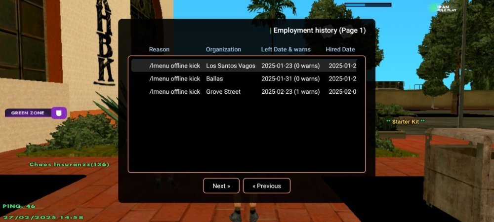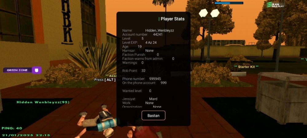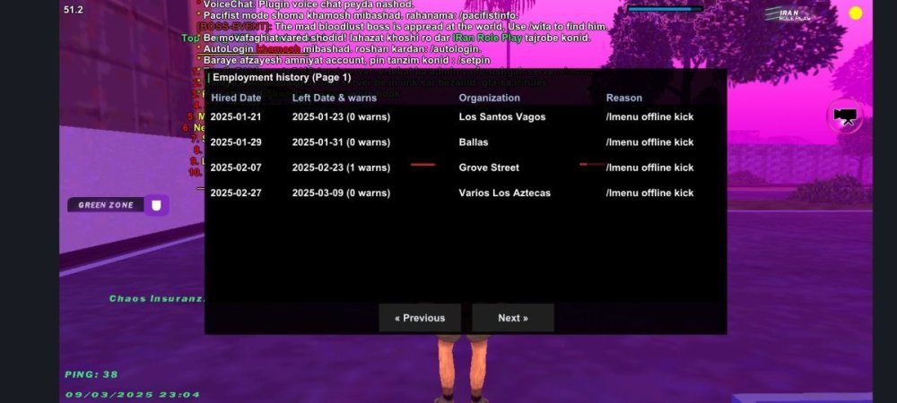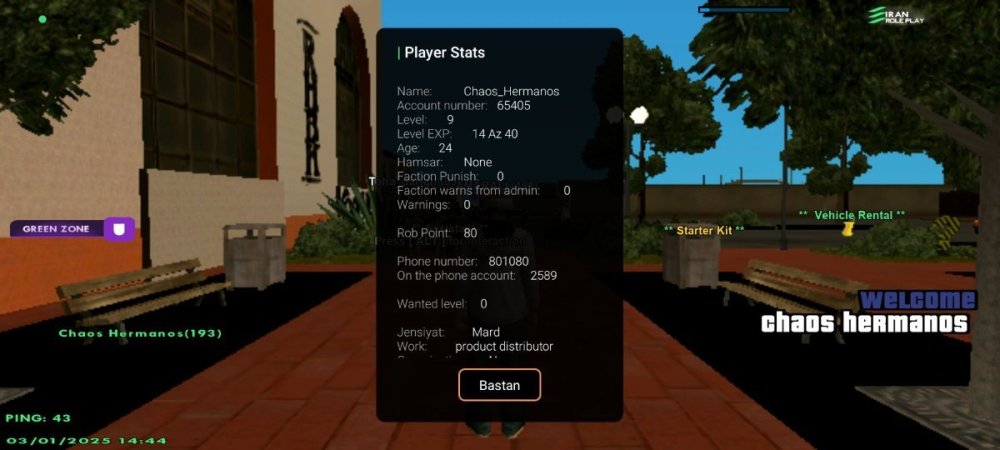 3. - نام حساب کاربری شما : Chaos_Wenbleyzz 2 - سطح حساب کاربری شما : 5 ۳ - سن شخصیت حساب کاربری شما : 19 4 - سوابق خود را در سازمان های جنایی شرح دهید : Vagos R7 Ballas R6 Aztecas R7 Rifa R7 Grove R7 توجه : عکس از wbook/ و stats/ حساب کاربری خود را حتما در پیام ارسال فرم بارگذاری کنید. اطلاعات OOC 1 - آیدی تلگرام : @ImChaosx 2 - آیدی دیسکورد : chaos_wenbleyzz 3 - مقدار تایم پلی روزانه : +2 4 - در چه حد از رول پلی آگاهی دارید و به قوانین آن مسلط هستید ؟ کامل 5 - در چه حد با نحوه کارکرد سایت انجمن آشنایی دارید ؟ کامل 🔸در صورتی که رهبر مربوطه شما را انتخاب کند، با شما در قسمت پیام های شخصی انجمن در ارتباط خواهد بود🔸