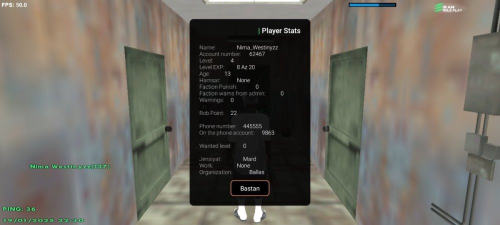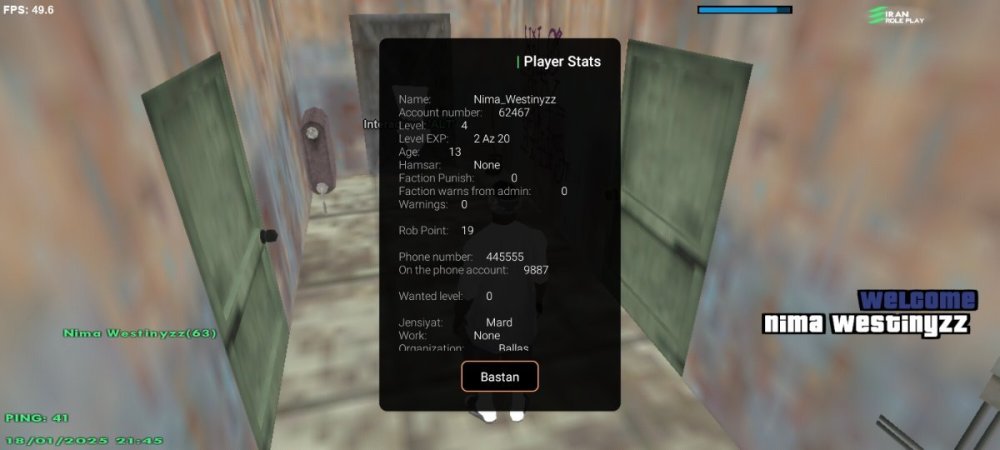 7. اطلاعات IC 1 - نام حساب کاربری شما : Nima_Westinyzz 2 - سطح حساب کاربری شما : 4 ۳ - سن شخصیت حساب کاربری شما : 13 4 - سوابق خود را در سازمان های جنایی شرح دهید : , No توجه : عکس از wbook/ و stats/ حساب کاربری خود را حتما در پیام ارسال فرم بارگذاری کنید. اطلاعات OOC 1 - آیدی تلگرام : @Westinyzz 2 - آیدی دیسکورد : Id Telam 3 - مقدار تایم پلی روزانه : 4 5 4 - در چه حد از رول پلی آگاهی دارید و به قوانین آن مسلط هستید ؟ Full 5 - در چه حد با نحوه کارکرد سایت انجمن آشنایی دارید ؟ Kamel