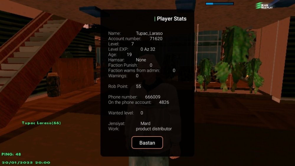 2. 1 - نام حساب کاربری شما :Tupac_Laraso 2 - سطح حساب کاربری شما :7 ۳ - سن شخصیت حساب کاربری شما :17 4 - سوابق خود را در سازمان های جنایی شرح دهید :هیچ توجه : عکس از wbook/ و stats/ حساب کاربری خود را حتما در پیام ارسال فرم بارگذاری کنید. اطلاعات OOC 1 - آیدی تلگرام :my_AmirMax 2 - آیدی دیسکورد :ندارم 3 - مقدار تایم پلی روزانه :۲تا۴ 4 - در چه حد از رول پلی آگاهی دارید و به قوانین آن مسلط هستید ؟درحدی که بتونم عضو شم 5 - در چه حد با نحوه کارکرد سایت انجمن آشنایی دارید ؟زیاد