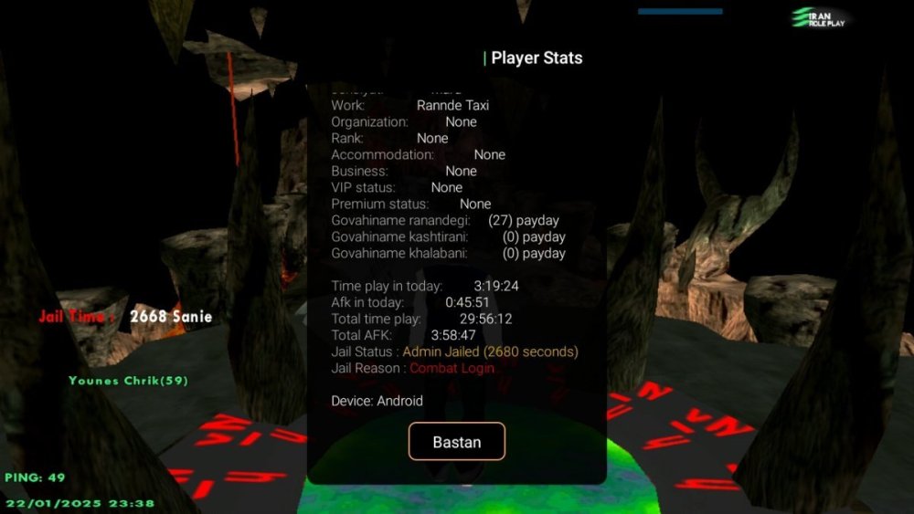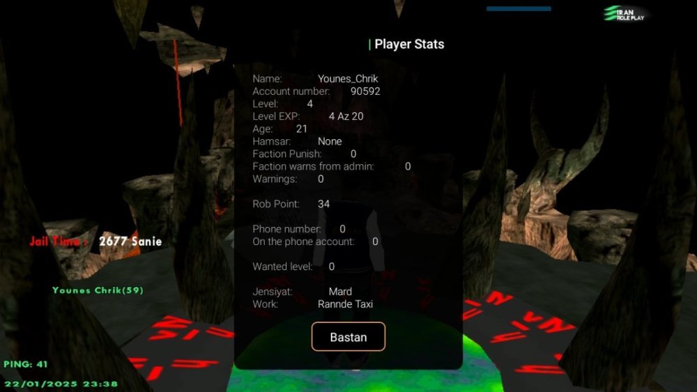 2. اطلاعات IC 1 - نام حساب کاربری شما :Younes_Chrik 2 - سطح حساب کاربری شما : 5 ۳ - سن شخصیت حساب کاربری شما : 21 4 - سوابق خود را در سازمان های جنایی شرح دهید : نبودم توجه : عکس از wbook/ و stats/ حساب کاربری خود را حتما در پیام ارسال فرم بارگذاری کنید. اطلاعات OOC 1 - آیدی تلگرام :younesloll@ 2 - آیدی دیسکورد :ندارم 3 - مقدار تایم پلی روزانه :+3h 4 - در چه حد از رول پلی آگاهی دارید و به قوانین آن مسلط هستید ؟Full 5 - در چه حد با نحوه کارکرد سایت انجمن آشنایی دارید ؟Full