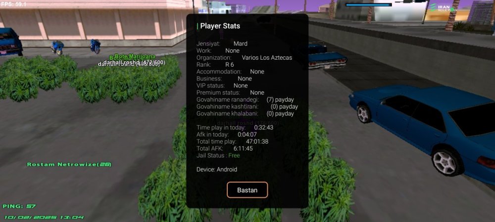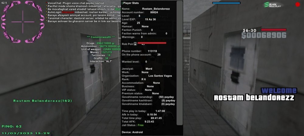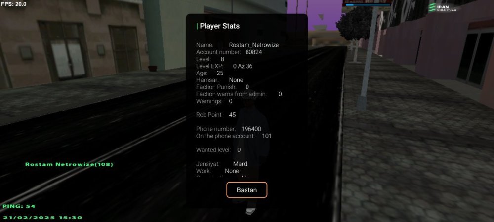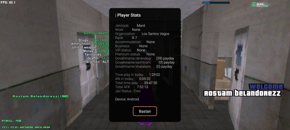 اطلاعات IC 1 - نام حساب کاربری شما :Rostam_Belandorezz 2 - سطح حساب کاربری شما :8 ۳ - سن شخصیت حساب کاربری شما :25 4 - سوابق خود را در سازمان های جنایی شرح دهید :None توجه : عکس از wbook/ و stats/ حساب کاربری خود را حتما در پیام ارسال فرم بارگذاری کنید. اطلاعات OOC 1 - آیدی تلگرام :Rostam_Belandorezz 2 - آیدی دیسکورد :None 3 - مقدار تایم پلی روزانه :+3 4 - در چه حد از رول پلی آگاهی دارید و به قوانین آن مسلط هستید ؟Full 5 - در چه حد با نحوه کارکرد سایت انجمن آشنایی دارید ؟Full -
