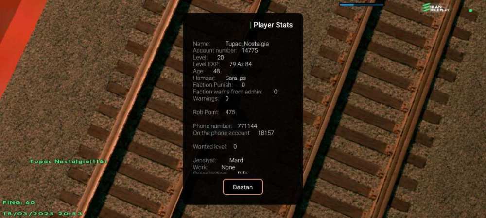 5. 1- نام حساب کاربری شما :Tupac_Nostalgia 2 - سطح حساب کاربری شما :20 ۳ - سن شخصیت حساب کاربری شما :48 توی عکس هست 4 - سوابق خود را در سازمان های جنایی شرح دهید : توجه : عکس از wbook/ و stats/ حساب کاربری خود را حتما در پیام ارسال فرم بارگذاری کنید. اطلاعات OOC 1 - آیدی تلگرام :@Tupac19966 2 - آیدی دیسکورد :ندارم 3 - مقدار تایم پلی روزانه :+8 4 - در چه حد از رول پلی آگاهی دارید و به قوانین آن مسلط هستید ؟کامل 5 - در چه حد با نحوه کارکرد سایت انجمن آشنایی دارید ؟کامل