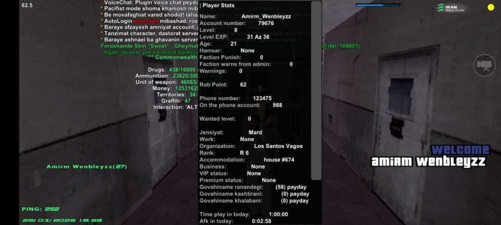 9. 1 - نام حساب کاربری شما : Amirm_Wenbleyzz 2 - سطح حساب کاربری شما : 8 ۳ - سن شخصیت حساب کاربری شما :21 4 - سوابق خود را در سازمان های جنایی شرح دهید : Aztecas Rifa Ballas Grov توجه : عکس از wbook/ و stats/ حساب کاربری خود را حتما در پیام ارسال فرم بارگذاری کنید. اطلاعات OOC 1 - آیدی تلگرام : @sharesokhte 2 - آیدی دیسکورد : amirm 3 - مقدار تایم پلی روزانه : 2 4 - در چه حد از رول پلی آگاهی دارید و به قوانین آن مسلط هستید ؟ کامل 5 - در چه حد با نحوه کارکرد سایت انجمن آشنایی دارید ؟کامل
