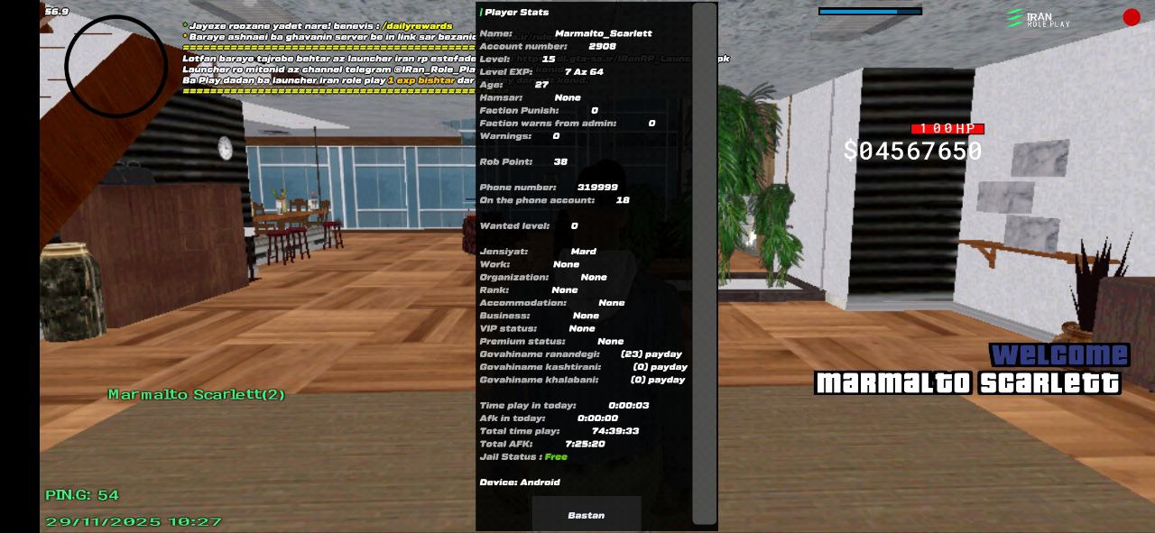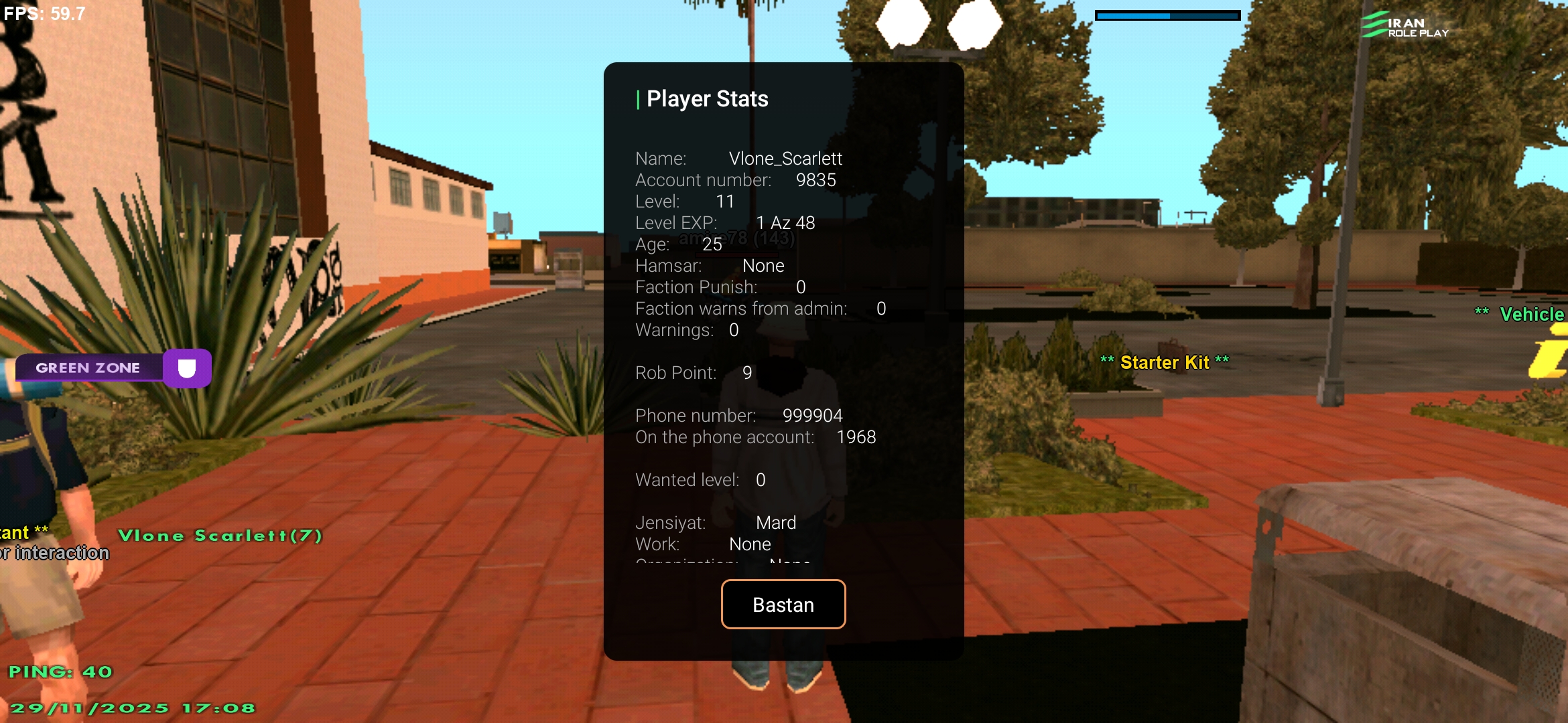 Kasra_Terrorist ارسال شده در November 29, 2025 at 12:19 #145826 ارسال شده در November 29, 2025 at 12:19 (ویرایش شده) اطلاعات IC 1 - نام حساب کاربری شما :Kasra_Terrorist 2 - سطح حساب کاربری شما :20 ۳ - سن شخصیت حساب کاربری شما :33 4 - سوابق خود را در سازمان های جنایی شرح دهید : Grove Street( R7 ) ( R7 ) Los Santos Vagos توجه : عکس از wbook/ و stats/ حساب کاربری خود را حتما در پیام ارسال فرم بارگذاری کنید. اطلاعات OOC 1 - آیدی تلگرام:@Kasra_Terrorist 2 - آیدی دیسکورد :ندارم 3 - مقدار تایم پلی روزانه :+5 4 - در چه حد از رول پلی آگاهی دارید و به قوانین آن مسلط هستید ؟کامل 5 - در چه حد با نحوه کارکرد سایت انجمن آشنایی دارید ؟کامل ویرایش شده در November 29, 2025 at 12:22 توسط Kasra_Terrorist نقل قول چندگانه نقل قول @ اشتراک گذاری