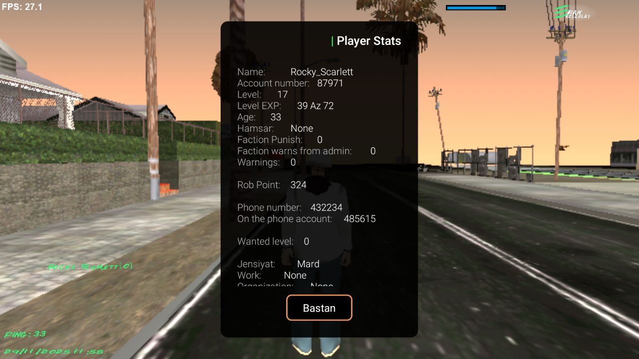 Rocky_Scarlett ارسال شده در November 29, 2025 at 13:09 #145838 ارسال شده در November 29, 2025 at 13:09 اطلاعات IC 1 - نام حساب کاربری شما :Rocky_Scarlett 2 - سطح حساب کاربری شما : 17 ۳ - سن شخصیت حساب کاربری شما :33 4 - سوابق خود را در سازمان های جنایی شرح دهید : Full R7 Vagos Offlaine kik balas توجه : عکس از wbook/ و stats/ حساب کاربری خود را حتما در پیام ارسال فرم بارگذاری کنید. https://rpfile.com/uploads/guest/2025/11/29/176442175635561.jpg اطلاعات OOC 1 - آیدی تلگرام : @Rocky_Scarlet 2 - آیدی دیسکورد : ندارم 3 - مقدار تایم پلی روزانه : 4+ 4 - در چه حد از رول پلی آگاهی دارید و به قوانین آن مسلط هستید ؟ Full 5 - در چه حد با نحوه کارکرد سایت انجمن آشنایی دارید ؟ Full نقل قول چندگانه نقل قول @ اشتراک گذاری