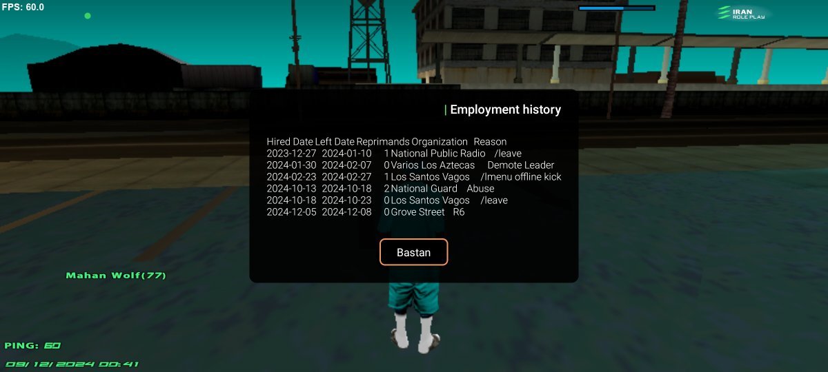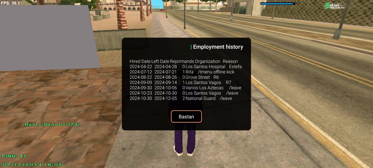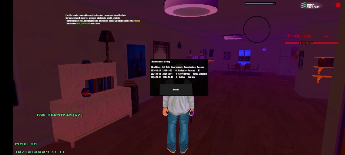 Henry_Genesis ارسال شده در December 9, 2024 at 11:39 #77494 ارسال شده در December 9, 2024 at 11:39 نام کاربری شما: Henry_Genesis 2 - سطح حساب کاربری شما :41 ۳ - سن شخصیت حساب کاربری شما :34 4 - سوابق خود را در سازمان های جنایی شرح دهید : Rifa lumen offline kick Grove Street r6 Vagos r7 Aztecas/leave Vagos/leave توجه : عکس از wbook/ و stats/ حساب کاربری خود را حتما در پیام ارسال فرم بارگذاری کنید. اطلاعات OOC 1 - آیدی تلگرام : Henrym5 2 - آیدی دیسکورد : mostafa_pho 3 - مقدار تایم پلی روزانه :+2 4 - در چه حد از رول پلی آگاهی دارید و به قوانین آن مسلط هستید ؟کامل 5 - در چه حد با نحوه کارکرد سایت انجمن آشنایی دارید ؟کامل نقل قول چندگانه نقل قول @ اشتراک گذاری