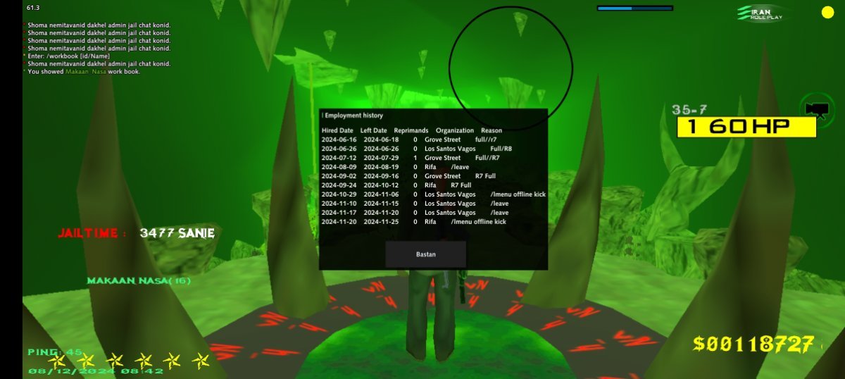 Kang_Crossbow ارسال شده در December 8, 2024 at 22:03 #77440 ارسال شده در December 8, 2024 at 22:03 اطلاعات IC 1 - نام حساب کاربری شما :Arvin_Moradi 2 - سطح حساب کاربری شما :11 ۳ - سن شخصیت حساب کاربری شما :23 4 - سابقه شما در سازمان های دولتی (به همراه رنک ها) : توجه : عکس از wbook/ و stats/ حساب کاربری خود را حتما در پیام ارسال فرم بارگذاری کنید. اطلاعات OOC 1 - آیدی تلگرام :Arvin_45651 2 - آیدی دیسکورد :arvin_saimonr 3 - مقدار تایم پلی روزانه :2.3 4 - در چه حد از رول پلی آگاهی دارید و به قوانین آن مسلط هستید ؟کامل 5 - آیا تا به حال برترین کارمند هفته دولتی بودهاید؟ اگر بله تعداد را بنویسید :نه 6 - در چه حد با نحوه کارکرد سایت انجمن آشنایی دارید ؟ کامل نقل قول چندگانه نقل قول @ اشتراک گذاری