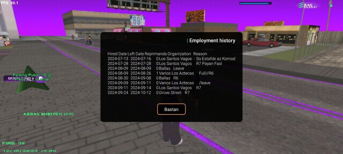 Mehdi_Phantom ارسال شده در December 11, 2024 at 10:50 #78082 ارسال شده در December 11, 2024 at 10:50 در ۱۴۰۲/۸/۷ در 01:02، Vip_Amir گفته است: درخواست عضویت در گنگ Varrios Los Aztecas ❓راهنما : جهت درخواست عضویت در گنگ Varrios Los Aztecas فرم زیر را پر کرده سپس در همین بخش ارسال نمایید. اطلاعات IC 1 - نام حساب کاربری شما :Mehdi_Phantom 2 - سطح حساب کاربری شما :9 ۳ - سن شخصیت حساب کاربری شما :20 4 - سوابق خود را در سازمان های جنایی شرح دهید : سابقه ندارم توجه : عکس از wbook/ و stats/ حساب کاربری خود را حتما در پیام ارسال فرم بارگذاری کنید. اطلاعات OOC 1 - آیدی تلگرام :@Mehdi6341 2 - آیدی دیسکورد :mehdi_phantom 3 - مقدار تایم پلی روزانه : 4 4 - در چه حد از رول پلی آگاهی دارید و به قوانین آن مسلط هستید ؟کامل 5 - در چه حد با نحوه کارکرد سایت انجمن آشنایی دارید ؟ کامل 🔸در صورتی که رهبر مربوطه شما را انتخاب کند، با شما در قسمت پیام های شخصی انجمن در ارتباط خواهد بود🔸 نقل قول چندگانه نقل قول @ اشتراک گذاری