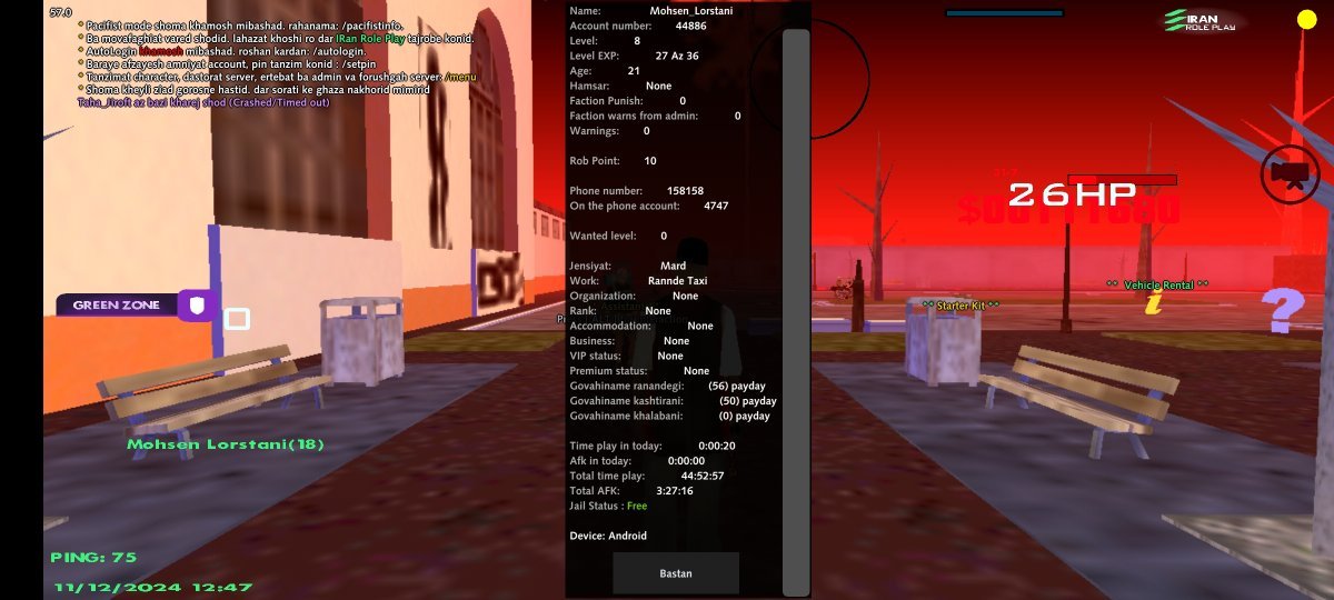 Mohammad_Bloody ارسال شده در December 11, 2024 at 12:06 #78100 ارسال شده در December 11, 2024 at 12:06 1 - نام حساب کاربری شما : Alireza_Bloody 2 - سطح حساب کاربری شما : 12 ۳ - سن شخصیت حساب کاربری شما : 29 4 - سوابق خود را در سازمان های جنایی شرح دهید : ندارم توجه : عکس از wbook/ و stats/ حساب کاربری خود را حتما در پیام ارسال فرم بارگذاری کنید. اطلاعات OOC 1 - آیدی تلگرام : Dghaghele@ 2 - آیدی دیسکورد : ندارم 3 - مقدار تایم پلی روزانه : 4+ 4 - در چه حد از رول پلی آگاهی دارید و به قوانین آن مسلط هستید ؟کامل 5 - در چه حد با نحوه کارکرد سایت انجمن آشنایی دارید ؟کامل نقل قول چندگانه نقل قول @ اشتراک گذاری